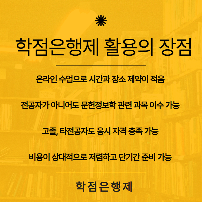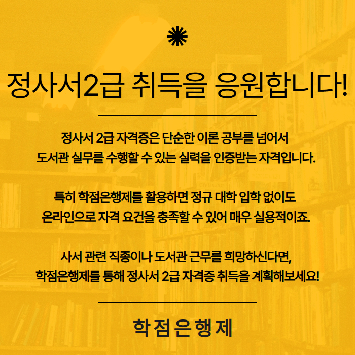 사서 관련 직종이나 도서관 근무를 희망하신다면, 학점은행제를 통해 정사서 2급 자격증 취득을 계획해보세요!