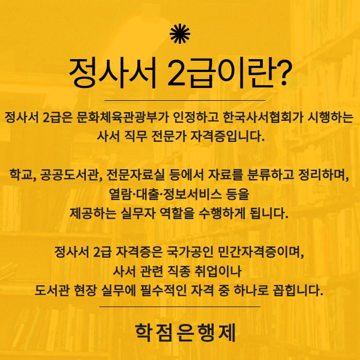 정사서 2급은 문화체육관광부가 인정하고 한국사서협회가 시행하는 사서 직무 전문가 자격증입니다.