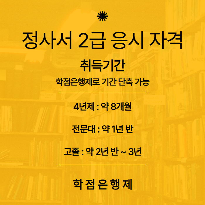 정사서 2급은 학력이나 경력, 전공에 따라 응시 조건이 다릅니다. 대표적인 응시 자격은 다음과 같습니다.