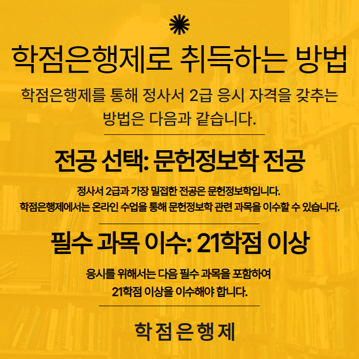 즉, 전공자가 아니더라도 학점은행제에서 사서 관련 교과목을 이수하면 정사서 2급 자격시험 응시가 가능하다는 것이 핵심입니다.